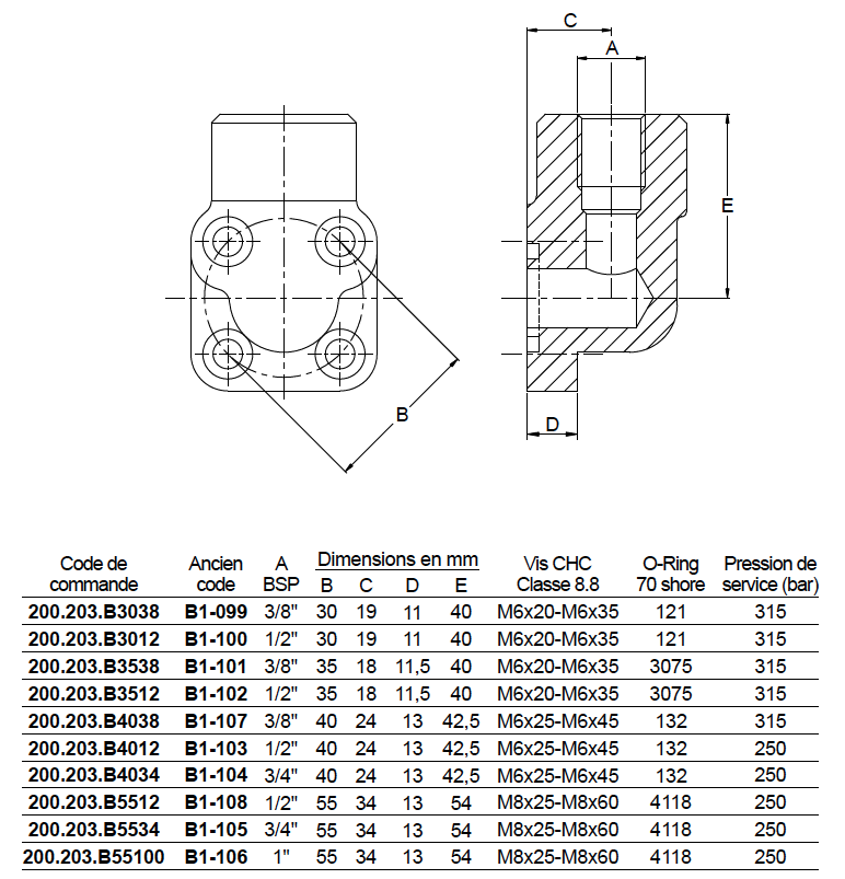 | Désignation | Bride acier coudée 4 trous entraxe 35 vis M6 taraudée 3/8" BSP |