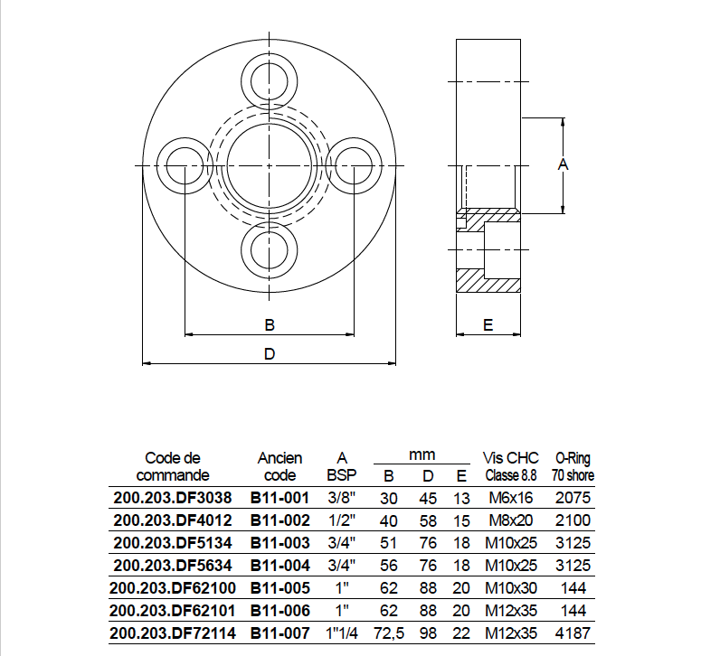 | Désignation | Bride acier droite entraxe 56 vis M10 taraudée 3/4" BSP |