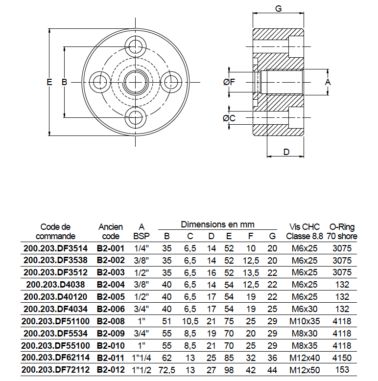 | Désignation | Bride acier droite entraxe 40 vis M6 taraudée 1/2" BSP |
