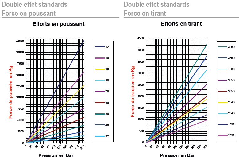 Pression de service : minimum 20 bar, maximum 200 bar, pour les vérins standards sous réserve de la limite de flambage (Option sur demande jusqu’à 350 bar). Vitesse maximum 0.5 m/sec. Température : -20°C à +90°C.